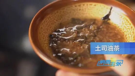 土司油茶,是彝族招待亲朋好友必备的美食。用到的食材有猪油、大米、楚雄当地的绿茶、生姜、盐以及草果、花椒等香料。大火燃起,炒热猪油,把大米炒到膨胀。之后,再加入茶叶和香料翻炒,火塘屋里立刻香气四溢,这个时候,加水煮开。