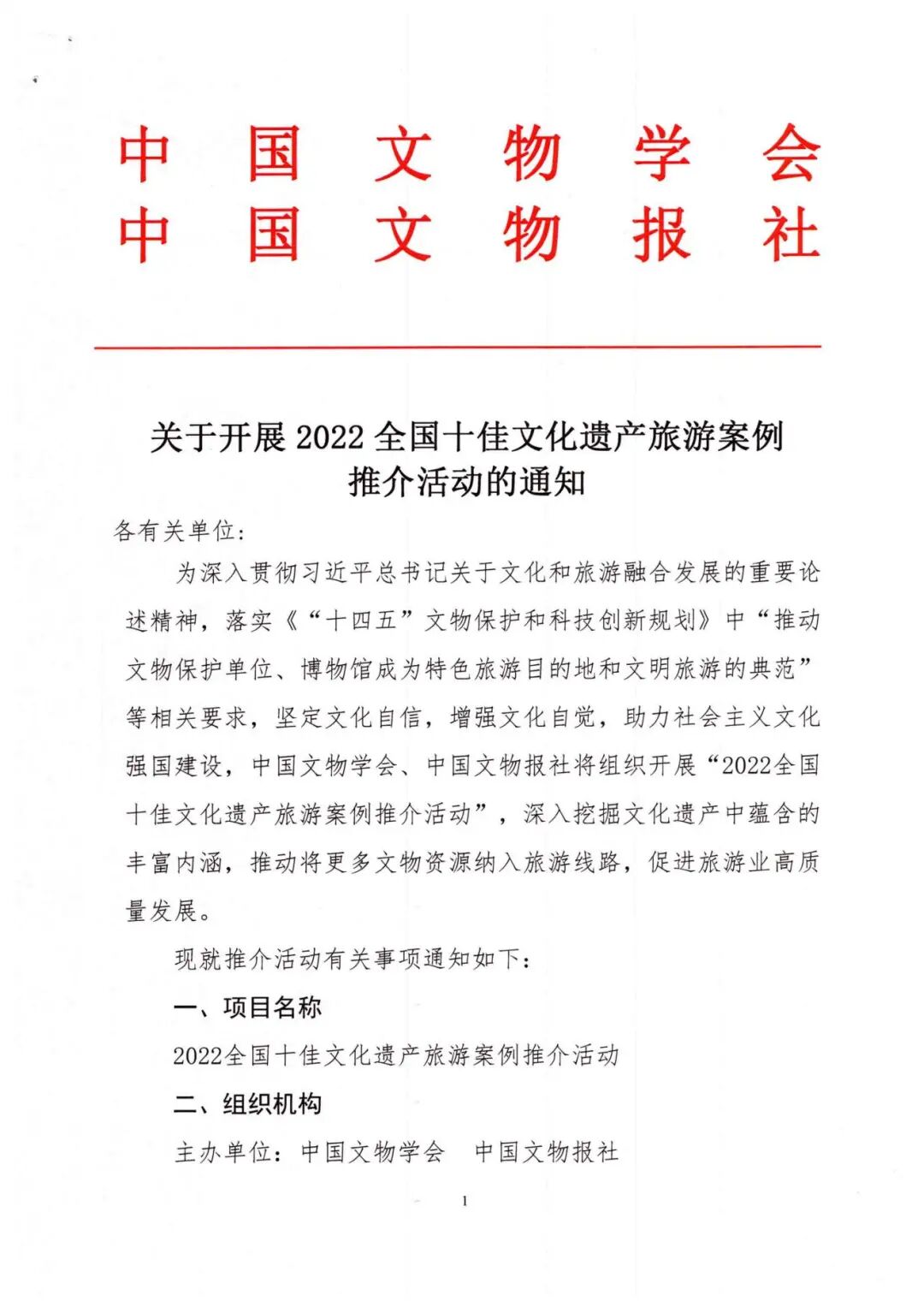 为深入贯彻习近平总书记关于文化和旅游融合发展的重要论述精神,落实《“十四五”文物保护和科技创新规划》中“推动文物保护单位、博物馆成为特色旅游目的地和文明旅游的典范”等相关要求,坚定文化自信,增强文化自觉,助力社会主义文化强国建设,中国文物学会、中国文物报社将组织开展“2022全国十佳文化遗产旅游案例推介活动”,深入挖掘文化遗产中蕴含的丰富内涵,推动将更多文物资源纳入旅游线路,促进旅游业高质量发展。