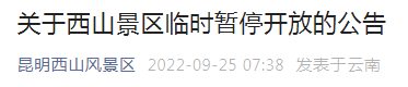 即刻起(2022年9月25日 7:30),西山景区(含猫猫箐社区)实行静态管理,任何游客不能进入景区。登山市民暂不入山。具体开放时间另行通知。给您带来不便敬请谅解。