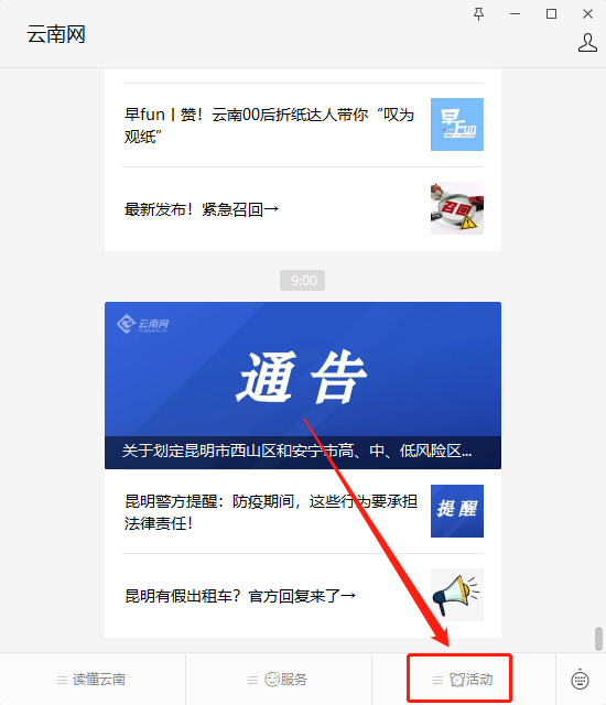 步骤二:进入“云南网”微信公众号,点击对话框下方“活动”菜单栏,再点击“我家云南美点赞”栏目选项,即可参与投票。