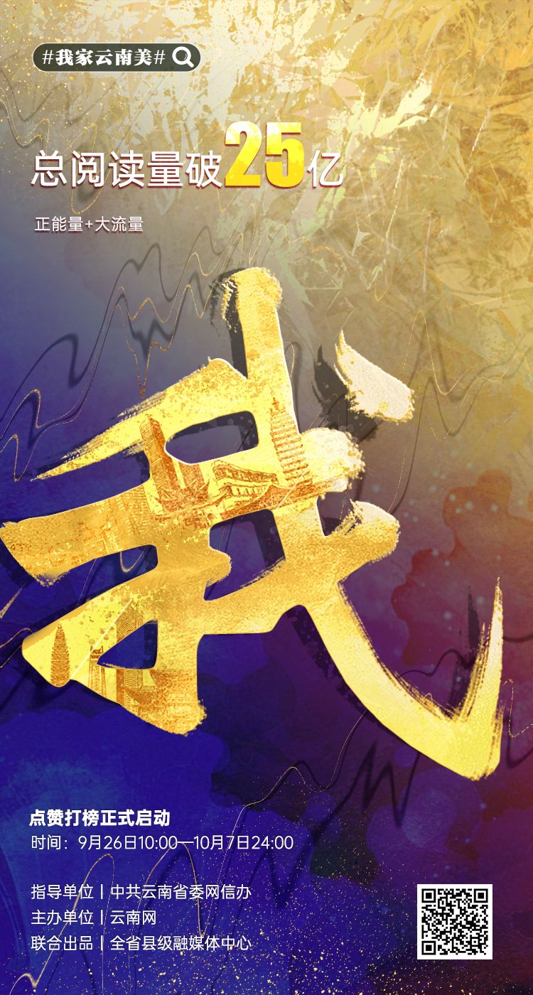 截至9月20日,#我家云南美#各平台总播放量(浏览量)超25亿次,其中抖音16.1亿次,快手5.4亿次,微博1.4亿次,相关子话题2.36亿次。冲上微博和抖音热搜50余次。