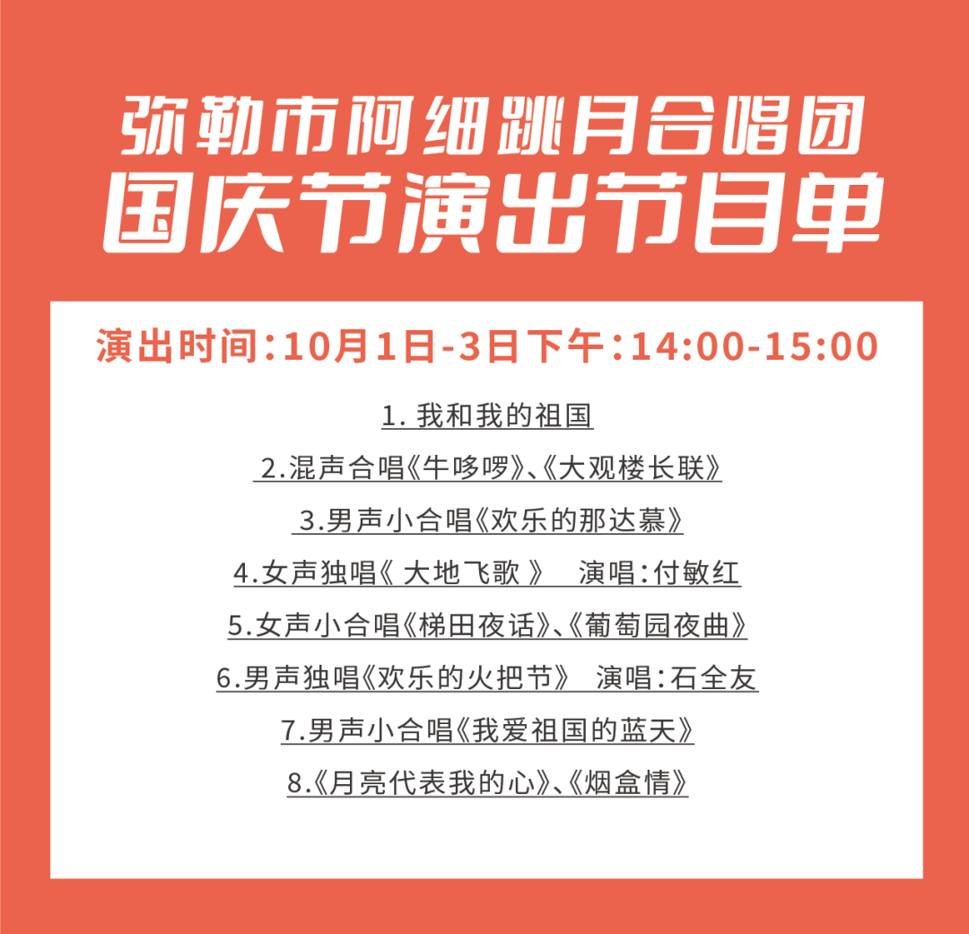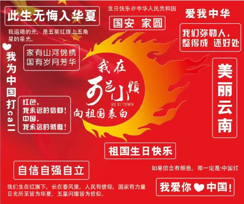 活动内容:在可邑小镇风景区民族歌舞表演互动环节,参与互动歌唱《我和我的祖国》表白祖国母亲,即可获得景区送出的精美礼品(民族特色包)。