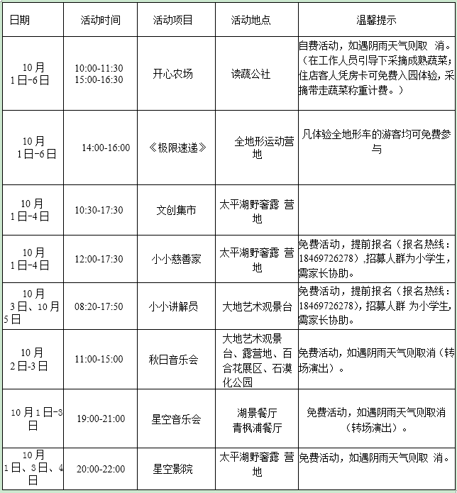国庆期间,将在太平湖野奢露营地举办游园文创集市、 秋日交响音乐会、摩旅同游会等一系列活动。