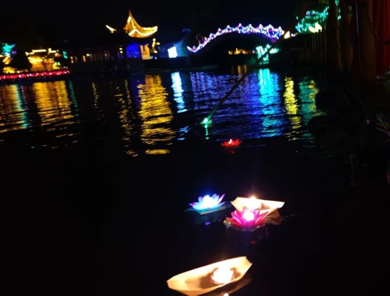 一盏、两盏、十盏、百盏……数不清的河灯在里运河上漂荡着。每一盏河灯都寄托着一份美好的祝福。