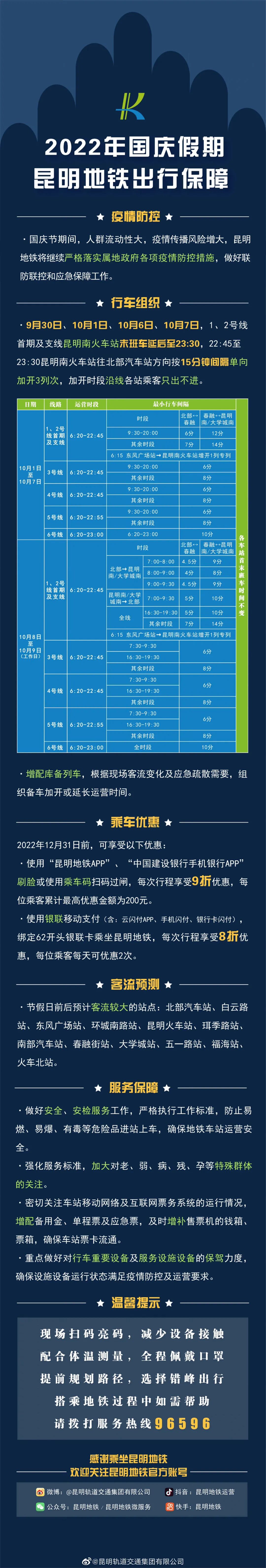 9月29日,昆明地铁发布2022年国庆假期昆明地铁出行保障提示,国庆节期间,昆明地铁将继续严格落实属地政府各项疫情防控措施,做好联防联控和应急保障工作。