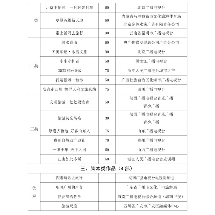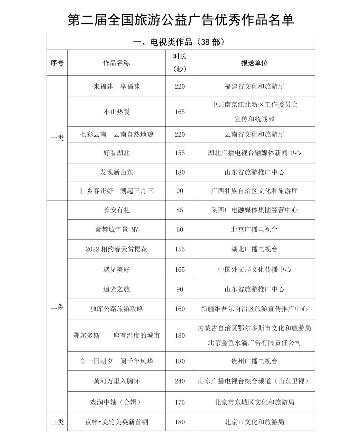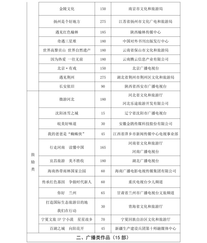 福建省文化和旅游厅报送的《来福建 享福味》、中共南京江北新区工作委员会宣传和统战部报送的《不止热爱》、云南省文化和旅游厅报送的《七彩云南 云南自然地貌》、湖北广播电视台融媒体新闻中心报送的《好看湖北》、山东省旅游推广中心报送的《发现新山东》、广西壮族自治区文化和旅游厅报送的《壮乡春正好 潮起三月三》等入选电视类作品;北京广播电视台报送的《北京中轴线 一列时光列车》、内蒙古自治区乌兰察布市文化旅游体育局与北京金色水滴广告有限责任公司报送的《草原英雄新天地》、云南省昆明市广播电视台报送的《带上爸妈去旅行》等入选广播类作品;湖南广播电视台电视剧频道报送的《跟着诗歌去旅行》等入选脚本类作品。