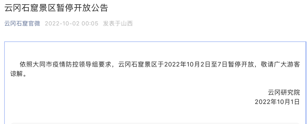 10月1日,山西省云冈石窟景区发布公告称,依照大同市疫情防控领导组要求,云冈石窟景区于10月2日至7日暂停开放。