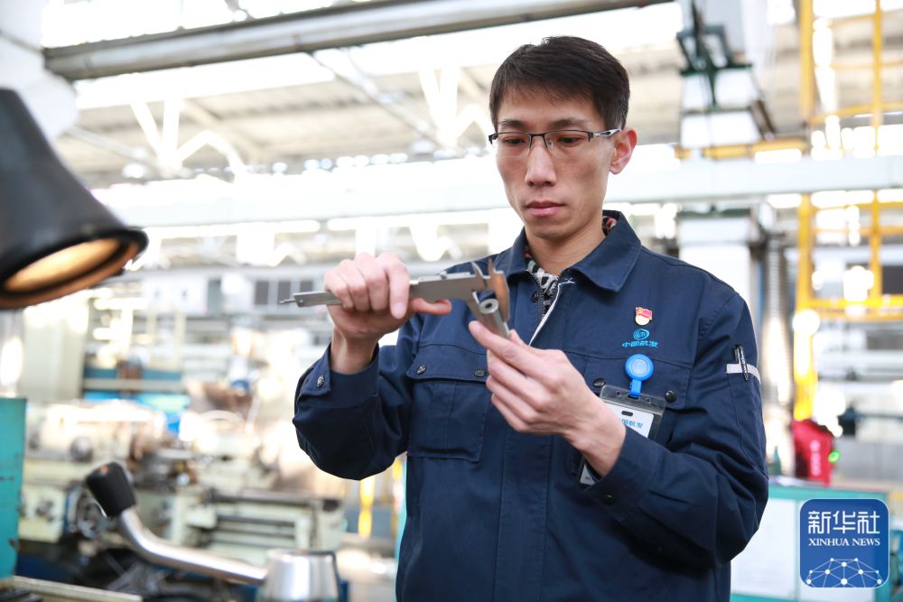 洪家光在车间用卡尺测量加工的工具零件(2018年1月3日摄)。 新华社发
