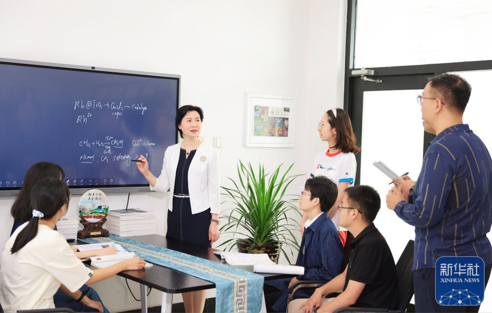 于吉红(中)与学生在一起讨论(2022年8月16日摄)。新华社发
