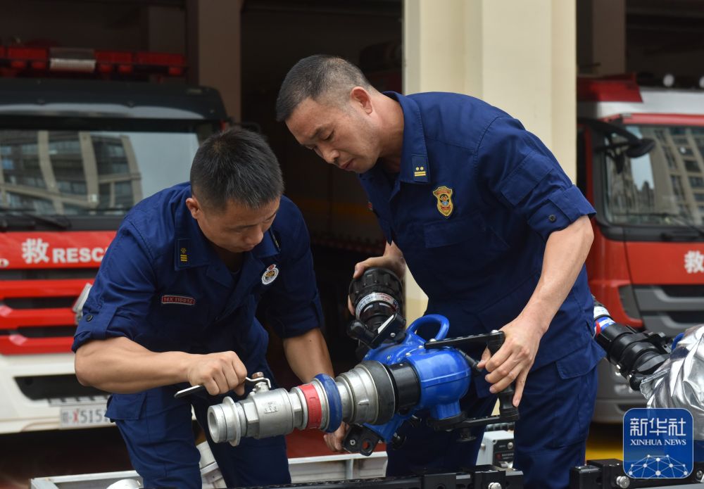 在江西省南昌市消防救援支队特勤大队营院内,李胜利(右)在检查装备器材(2020年10月8日摄)。新华社发(熊超 摄)
