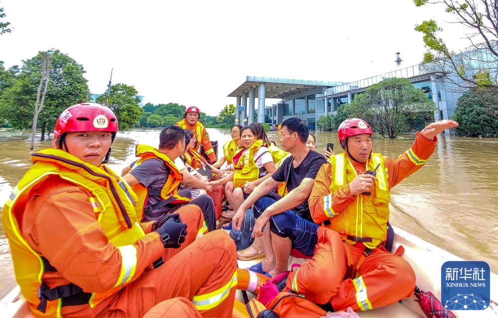 在河南省郑州市中牟县,李胜利(左一)在疏散被困群众(2021年7月19日摄)。新华社发(田聪 摄)