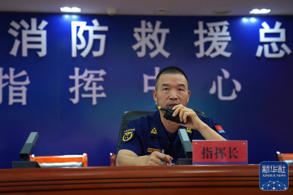 江西省消防救援总队指挥中心专业技术一级指挥长李胜利在江西消防救援总队指挥中心进行远程调度(2022年9月14日摄)。新华社记者 万象 摄
