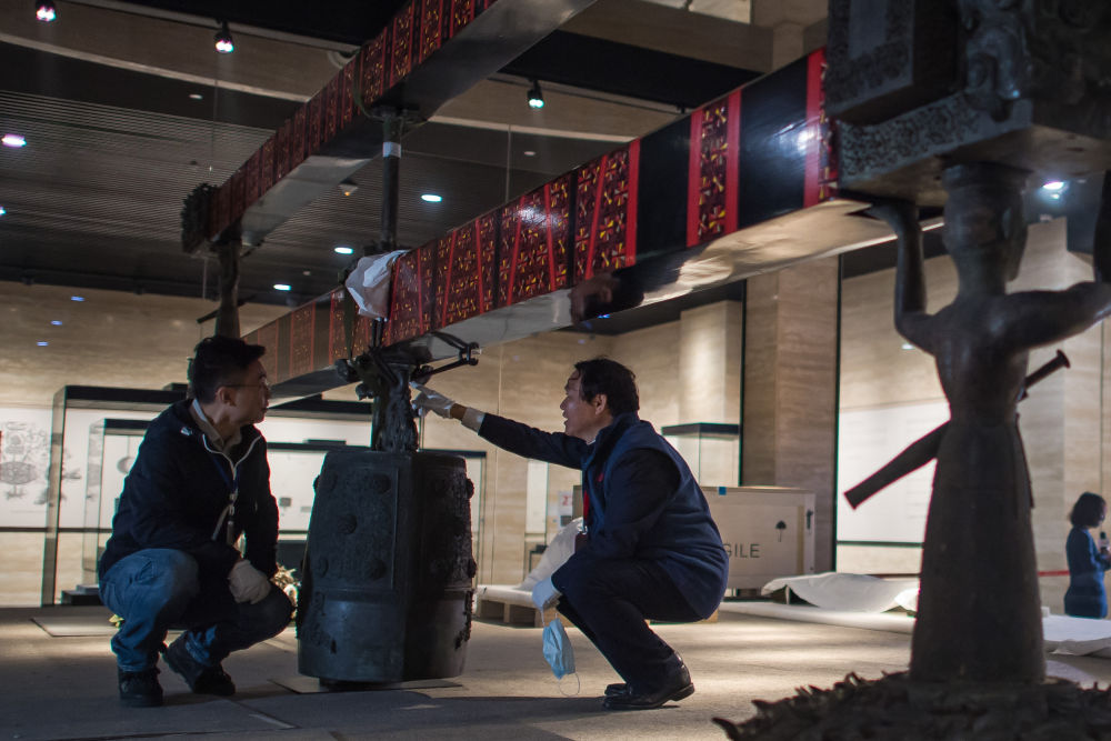 方勤在湖北省博物馆新馆曾侯乙展厅组织移动安装曾侯乙编钟(2021年10月14日摄)。新华社记者 肖艺九 摄