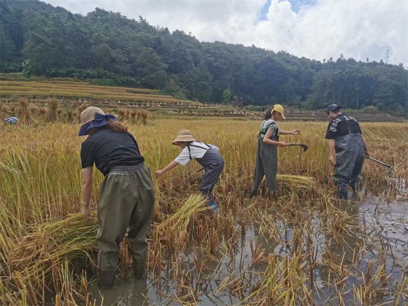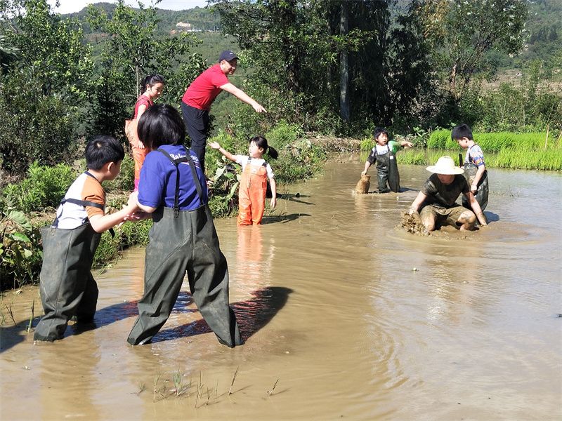 你可以和当地人一起背上背篓,徒步穿过田埂,打谷子、谷船赛、编草人,抓一篓梯田鱼,在田野里撒欢,这一刻,好像回到了童年无忧无虑的时光。