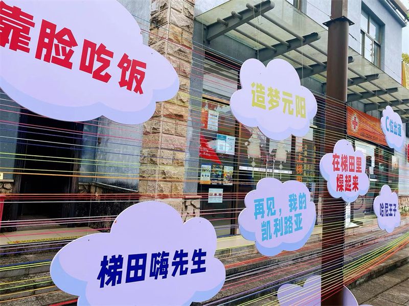 走进元阳哈尼梯田景区,就可以看到一个造型可爱的打卡点。五彩斑斓的彩虹门与蓝天白云相映成趣,“疯狂为梯田打call”“我是梯田小仙女”等有趣的标语吸引了不少人在此拍照,开启在元阳哈尼梯田游玩的第一步。