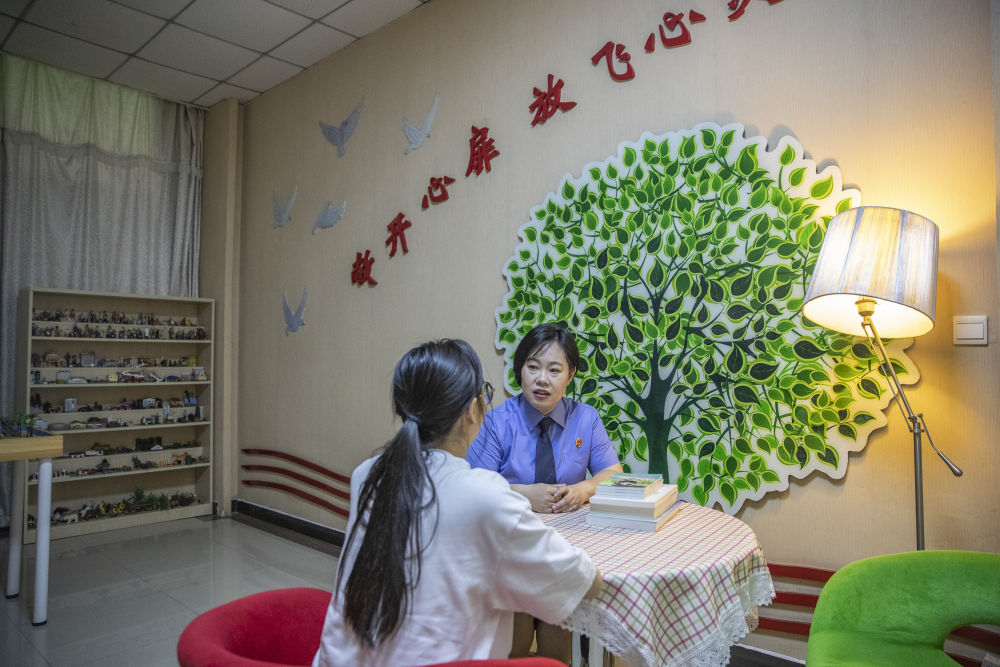 9月20日,在重庆市大渡口区人民检察院“莎姐”谈心室内,梅玫与一名前来咨询的未成年人谈心。新华社记者 黄伟 摄