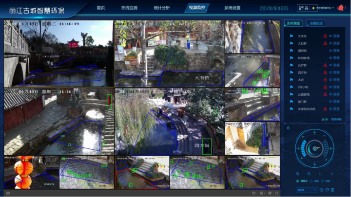 水是丽江古城的灵魂,为保护丽江古城水环境,实施智慧环保项目,实现了河道环境查看、河道入侵报警、执法监管取证等智慧治理。安装3处水质监测站、6个水流监测站,对水的PH酸碱值、溶解氧、浑浊度、电导率等指标进行监测;设立了11个电子围栏视频监控探头,如有游客或餐饮酒吧等场所向河道内排污水、丢垃圾等违规行为,中心值班人员将及时分派执法人员进行相应处理。