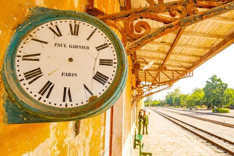 滇越铁路碧色寨车站站房门前,法国工程师尼弗里士当年刻下的法文北回归线标记,如今依旧清晰可见。巴黎制造的三面钟挂在站前,守望百年时光。