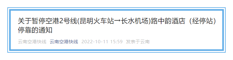 10月11日,云南机场汽车运输服务有限公司发布关于暂停空港2号线(昆明火车站→长水机场)路中韵酒店(经停站)停靠的通知,自2022年10月12日00:00起开始执行。详情如下: