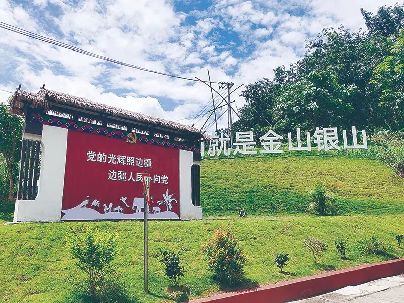 金秋时节,沿着蜿蜒的盘山公路来到景洪市戈牛村委会博洛寨村小组,村口左右两侧平整葱绿的草坪引人入胜,仿佛一个大花园。“绿水青山就是金山银山”“铸牢中华民族共同体意识”等标语牌设置在草坪上,格外醒目。