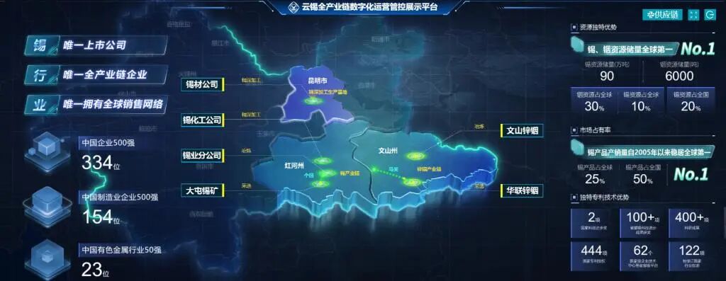 采矿领域,“缓倾斜矿体超前切顶采矿环境再造协同开采综合技术”,达到国际领先水平,荣获中国有色金属工业科学技术一等奖。选矿领域,“铟锌锡铜共伴生多金属矿资源高效利用关键技术及产业化”项目,整体技术达国际领先水平,获云南省科技进步一等奖。冶炼领域,锡冶炼异地搬迁升级改造作为云南省首个“退城入园”标杆项目,创造了“五个世界之最”,代表了当今世界锡冶炼一流技术和装备水平;12.5万吨/年铜冶炼项目是目前全球唯一一座双顶吹铜冶炼项目,荣获2017年度中国有色金属工业科学技术一等奖;“复杂多金属锌精矿绿色高效冶炼新技术”填补了中国锌冶炼技术空白,荣获2019年度中国铅锌行业创新发展杰出贡献奖。精深加工领域,联合云天化股份有限公司,共同申报实施省科技厅重点科技项目锡-磷无卤阻燃剂产品研究与关键技术开发,建设500吨/年锡-磷阻燃材料示范线,填补云南在木制品和高分子材料应用领域高附加值阻燃材料的空白。信息化领域,完成全产业链数字化运营管控展示平台建设,充分展示云锡全产业链数字化、智能化、科技创新成果、双链互动情况。