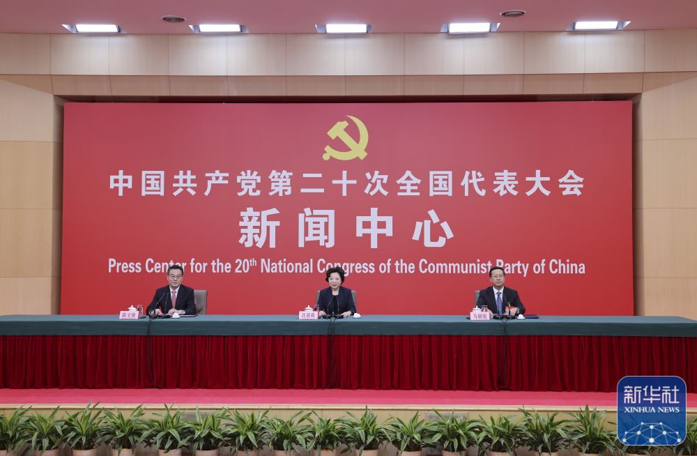 10月20日,中国共产党第二十次全国代表大会新闻中心举行记者招待会。中央对外联络部副部长沈蓓莉,外交部党委委员、副部长马朝旭围绕“习近平外交思想指引中国特色大国外交开拓前行”主题与记者交流。新华社记者 张玉薇 摄