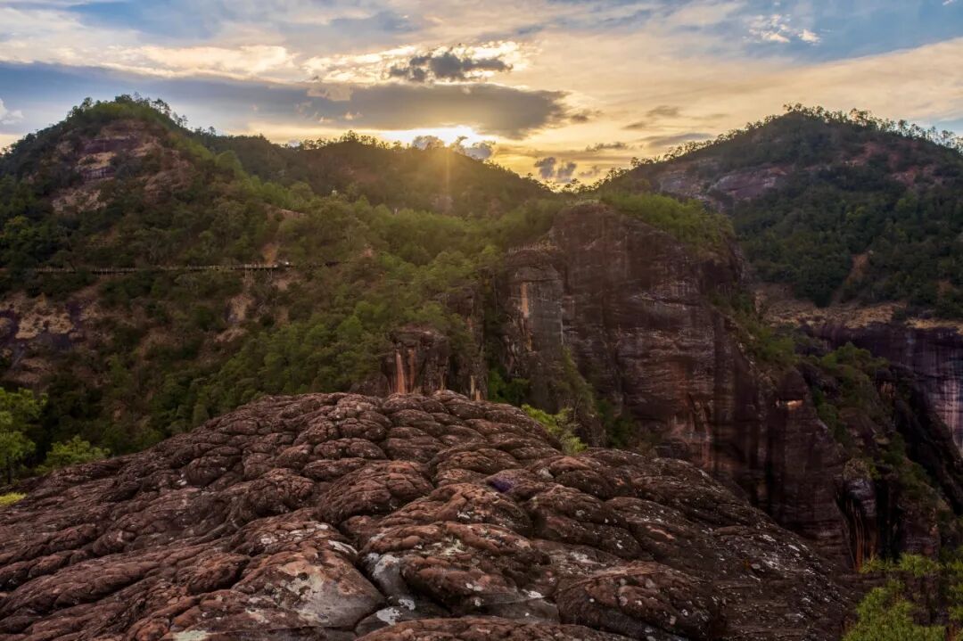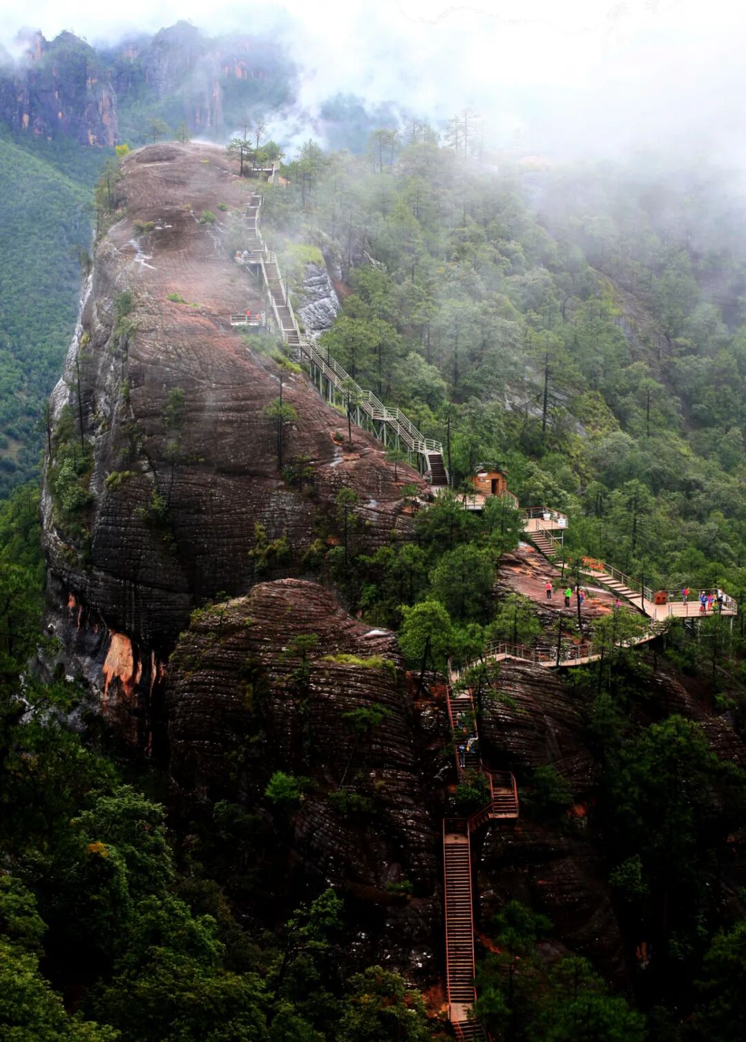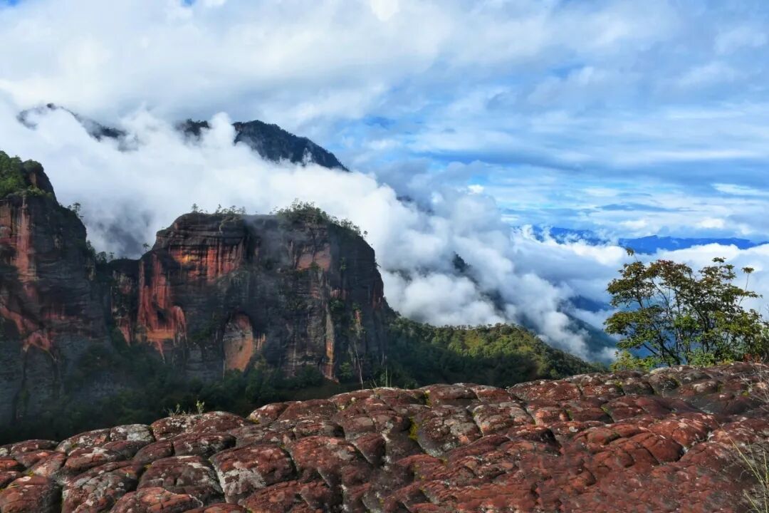 高山丹霞是这里最具特色地貌,云雾环绕、苍翠之间,丹霞点缀其间,形如千万只小乌龟又组成一只大乌龟,排列自然有序,美轮美奂、自然天成的美,最能震撼心灵。