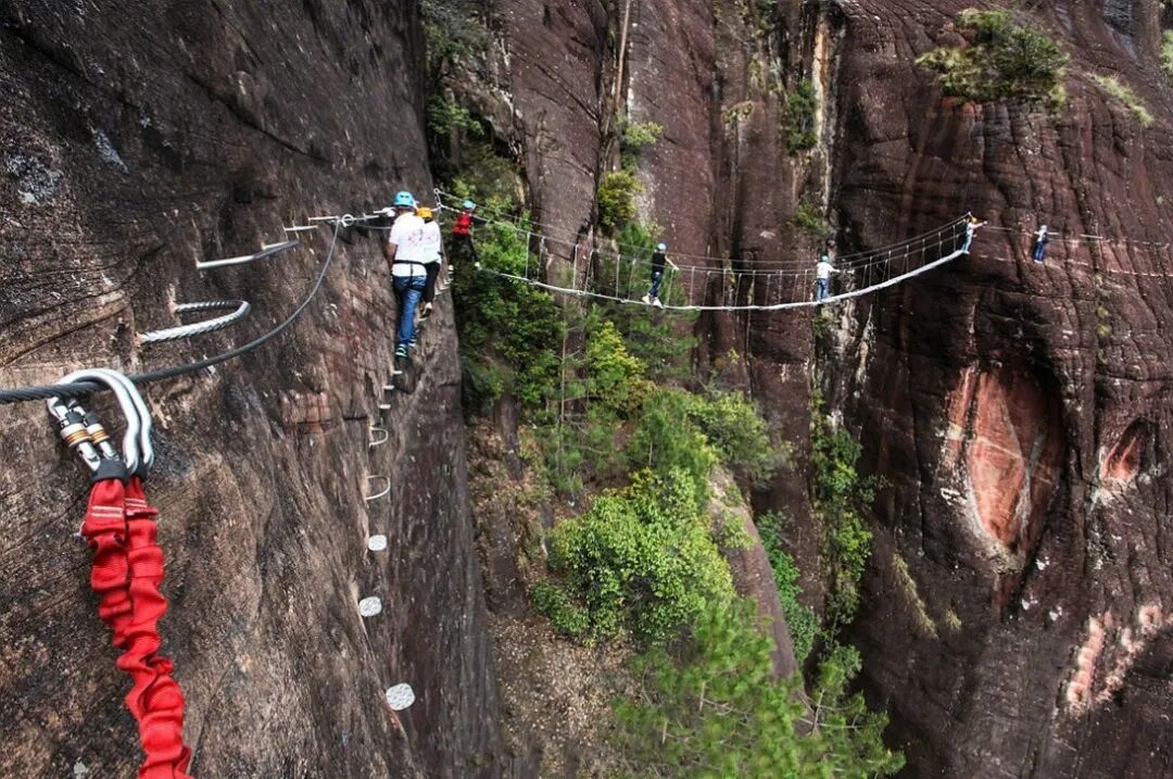丽江老君山国家公园黎明景区的“飞拉达”是世界上海拔最高、落差最大的铁索攀登项目。老君山飞拉达有两条线路:①号初级线路和②号挑战线路,其中初级线路适合7—70岁身体健康无攀岩经验者在教练指导下掌握要领后均可参加,安全性高、娱乐性强、线路灵活多样。