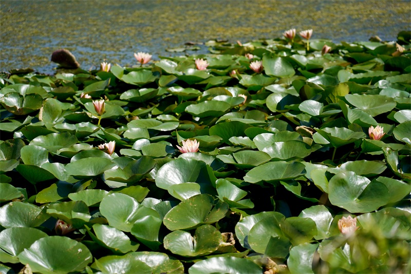 在星云北岸的环湖生态调蓄带里,悠悠的水面上莲叶成片,一朵朵粉色的、紫色的、白色的睡莲跃然水面、竞相开放,形成了一池清水半池莲的独特风景,惹人驻足欣赏。