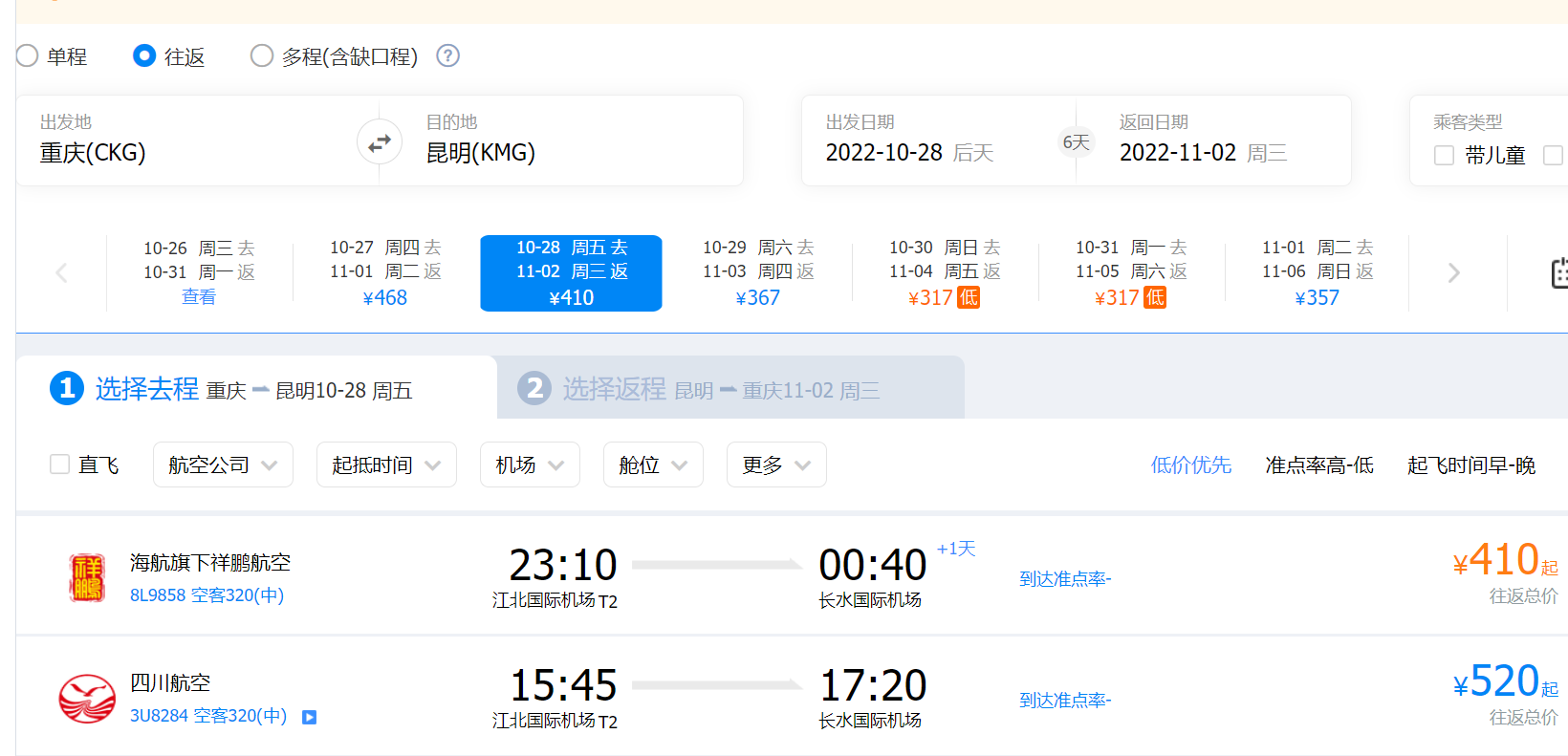 以OTA平台旅游产品发布账号属地(重庆)为出发地,不含机建燃油费用,重庆至昆明往返机票最低需要410元起。