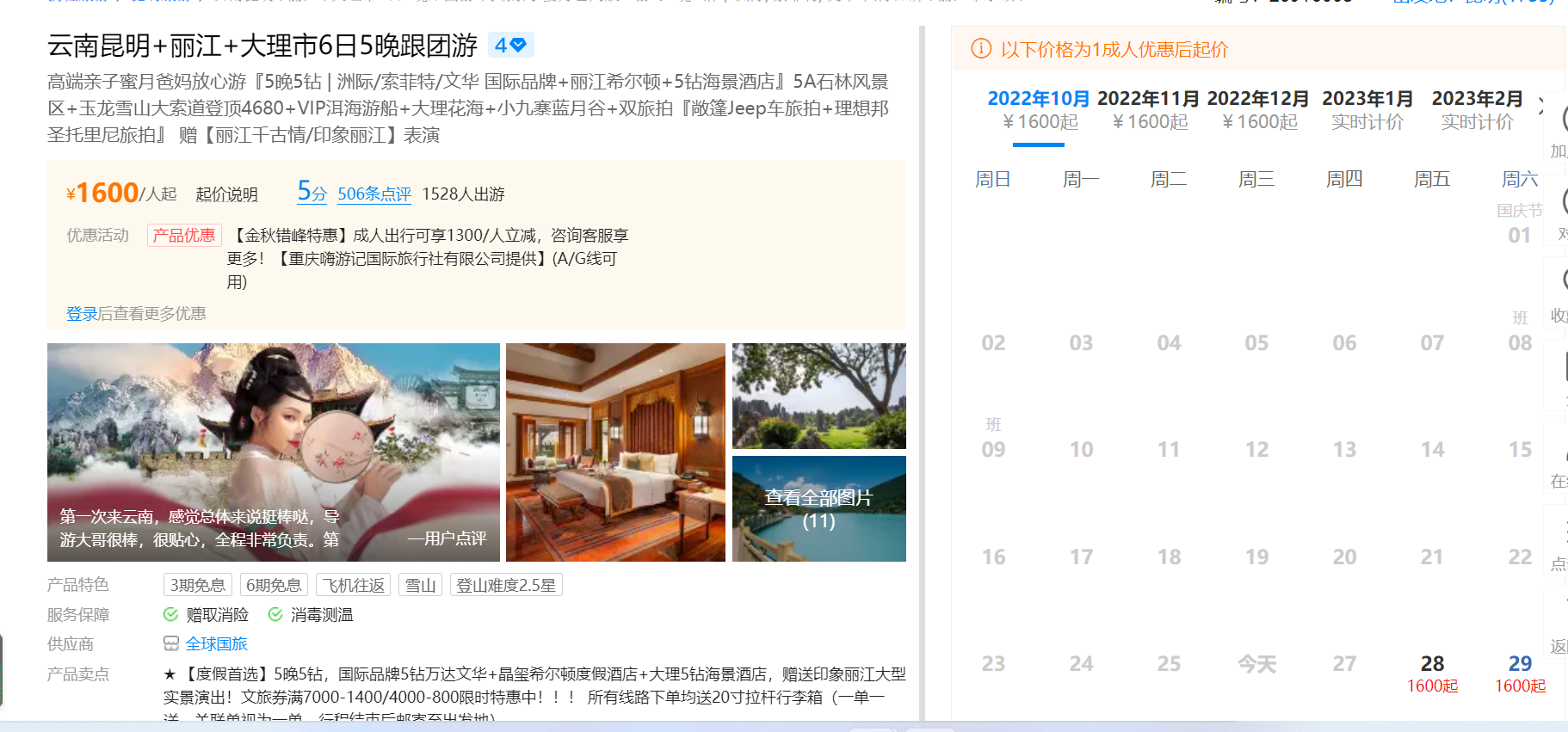 2022年10月26日,“游舆文旅大数据系统”监测到:云南昆明+丽江+大理市6日5晚跟团游