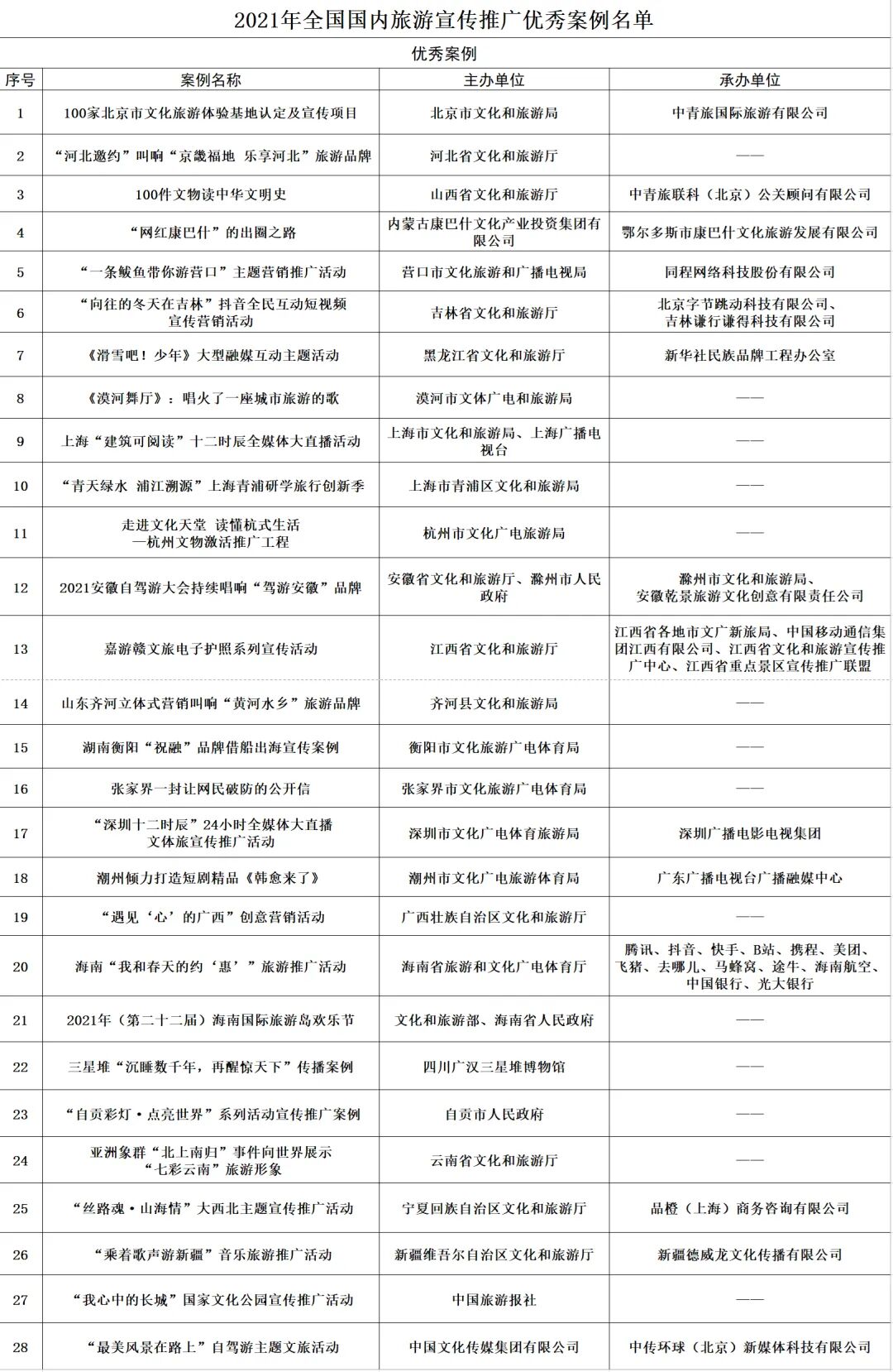 根据《文化和旅游部资源开发司关于推荐2021年国内旅游宣传推广优秀案例的通知》(资源函〔2022〕1号)要求,经有关省级文化和旅游行政部门、文化和旅游部有关直属单位推荐,本着树标杆、立典范、强引领原则,经专家组评选,确定28个案例为2021年国内旅游宣传推广优秀案例。现将案例名单予以公布。