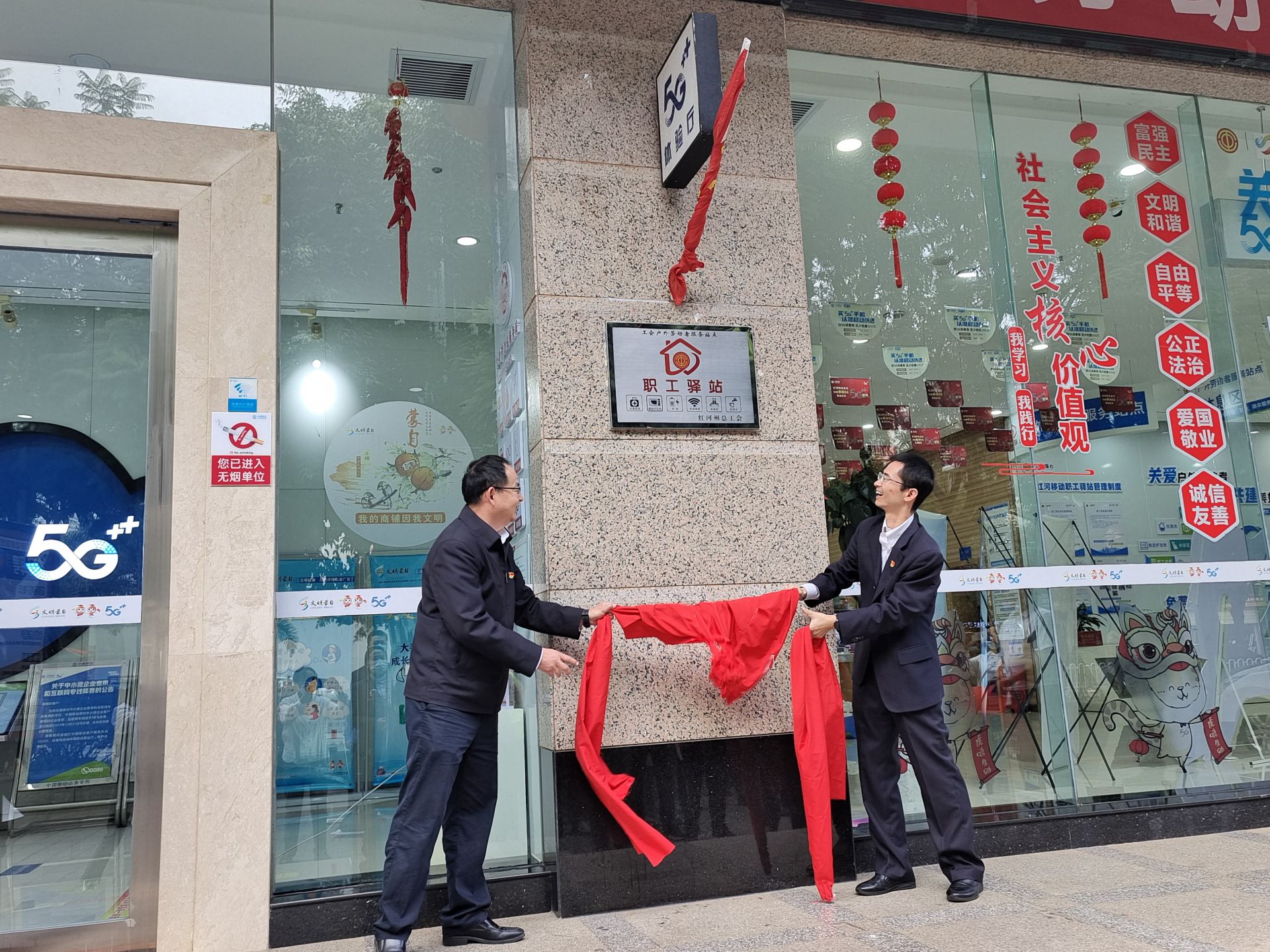 仪式上,红河州总工会党组书记、常务副主席姜云,红河州移动公司红河州移动公司党委委员、副总经理、工会主席李智东共同为“职工驿站”揭牌。