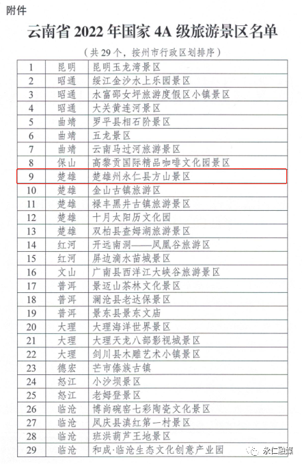 根据国家标准《旅游景区质量等级管理办法》和《旅游景区质量等级的划分与评定》,经相关州(市)文化和旅游局初评推荐,云南省文化和旅游厅按程序组织评定并于2022年9月23日完成公示。现确定昆明玉龙湾景区等29家景区为国家 4A 级旅游景区(名单见附件)。