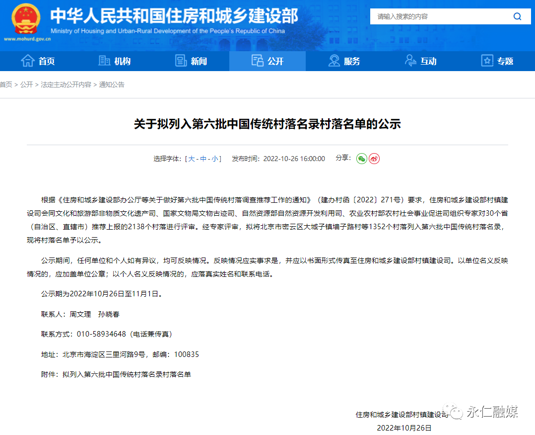 根据《住房和城乡建设部办公厅等关于做好第六批中国传统村落调查推荐工作的通知》(建办村函〔2022〕271号)要求,住房和城乡建设部村镇建设司会同文化和旅游部非物质文化遗产司、国家文物局文物古迹司、自然资源部自然资源开发利用司、农业农村部农村社会事业促进司组织专家对30个省(自治区、直辖市)推荐上报的2138个村落进行评审。经专家评审,拟将北京市密云区大城子镇墙子路村等1352个村落列入第六批中国传统村落名录,现将村落名单予以公示。