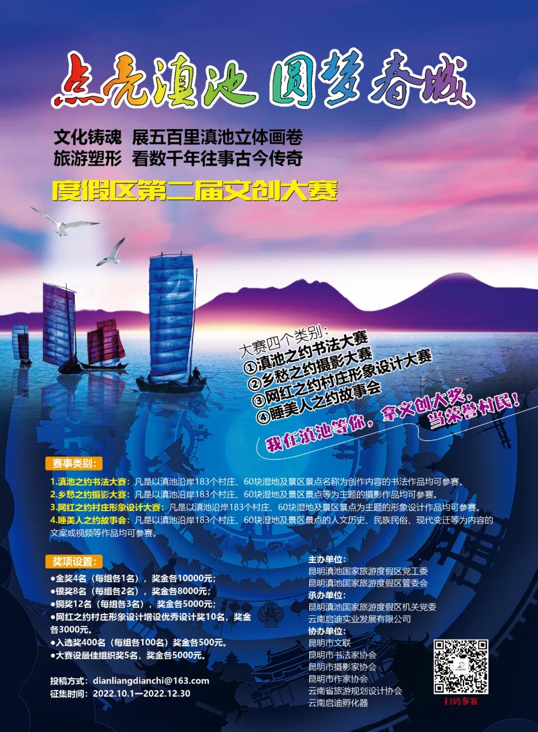 详情扫码下载、注册“滇池度假”APP,关注首页“点亮滇池 圆梦春城”度假区第二届文创大赛专栏。