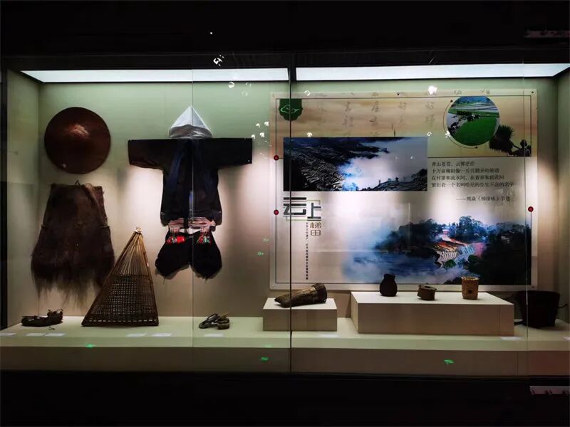 展览现场,可以看到红河州博物馆收藏的一批民族、民俗文物与资料,包括哈尼梯田农耕用具、哈尼族及梯田片区各少数民族服饰、生活用品、祭祀用品、书籍及影像资料等。