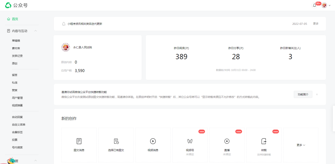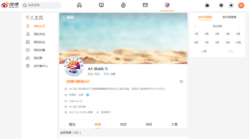 截止2022年10月共计发布微博近560余条,其中原创390余条;截止2022年10月,微信公众号共计发布新闻信息850余条,其中原创信息400余条,微信公众号粉丝达3574人并持续增长。每一条信息、每一段视频、每一张图片都记录了永仁法院的发展和变迁,也在时代的浪潮中镌刻下永不磨灭的痕迹。
