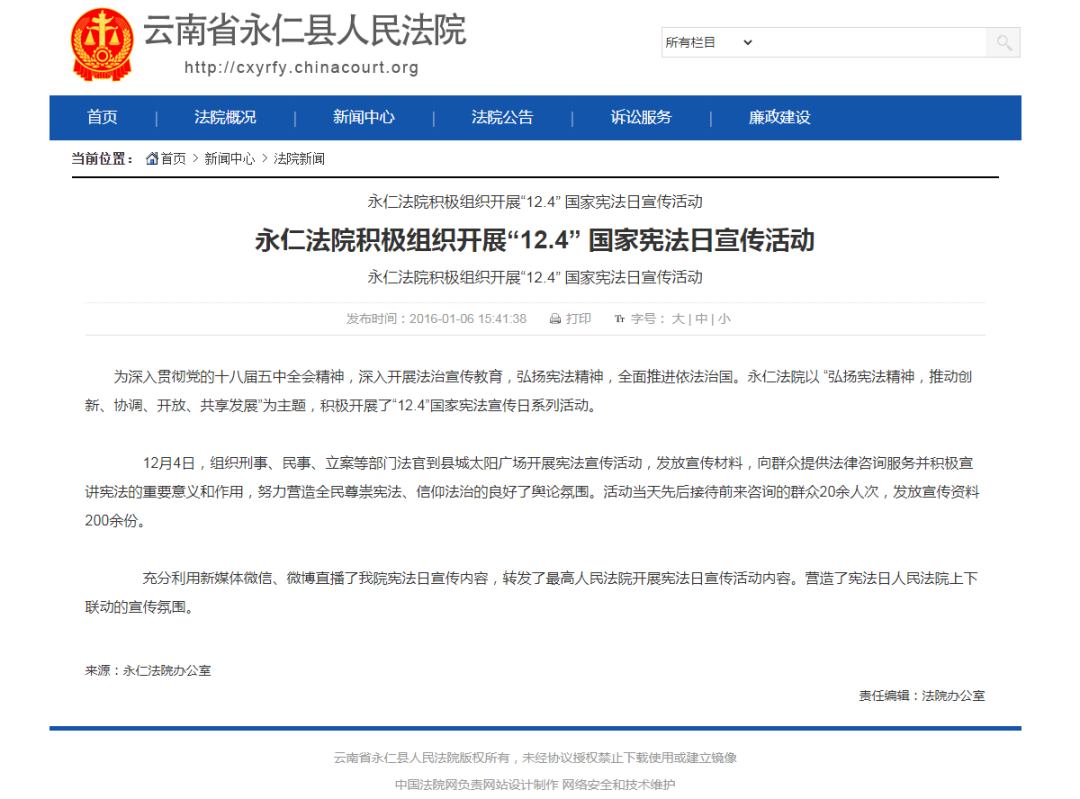 为更好促进司法公开,展示法院形象,2013年12月30日永仁法院官方微博“永仁县法院”正式开通,2016年1月6日在永仁县人民法院官方网站“法院新闻”专栏发布第一条信息《永仁法院积极组织开展“12.4” 国家宪法日宣传活动》,2016年8月26日官方微信公众号“永仁县人民法院”发布第一条新闻信息《楚雄州中级人民法院李红云副院长一行到永仁法院检查指导工作》, 2020年7月21日永仁法院开通七彩云端APP客户端账号,此后,永仁法院迅速迈入新媒体时代!经过多年的策划运营,官方微博和微信公众号的影响力不断扩大。