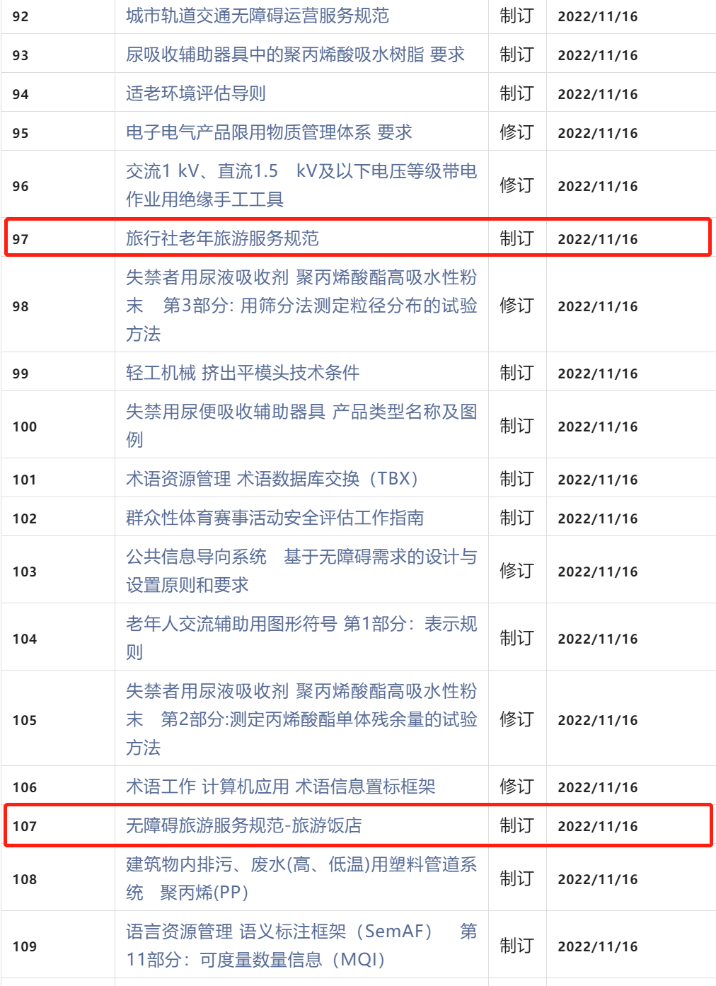 近日,全国旅游标准化技术委员会就旅游业国家标准《旅行社老年旅游服务规范》《无障碍旅游服务规范-旅游饭店》拟立项项目公开征求意见。详情如下:
