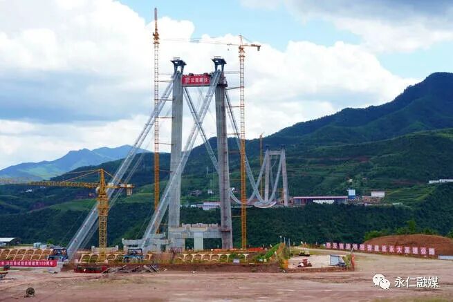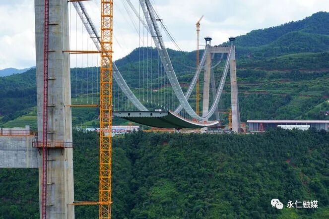 永仁大桥位于永仁县和大姚县交界,跨越江底河峡谷,大桥全长1668米,主跨920米的双塔单跨重力式锚碇钢箱梁悬索桥,主塔高192.7米,桥面距江底河峡谷谷底约360米。是云南省在建第一大同类型桥梁,建成后将是云南省第三大同类桥梁,也将是楚雄州重要的地标性建筑。由于所在区域自然环境复杂,峡谷风力大,雨季周期长,给施工带来了不少困难。中铁大桥局八公司项目部充分发扬“山区建桥铁军”精神,制定了专项吊装方案,创造性改良施工工艺,采取24小时作业,有效提高钢箱梁吊装过程中的安全性和作业效率,确保全面完成今年年度生产目标。