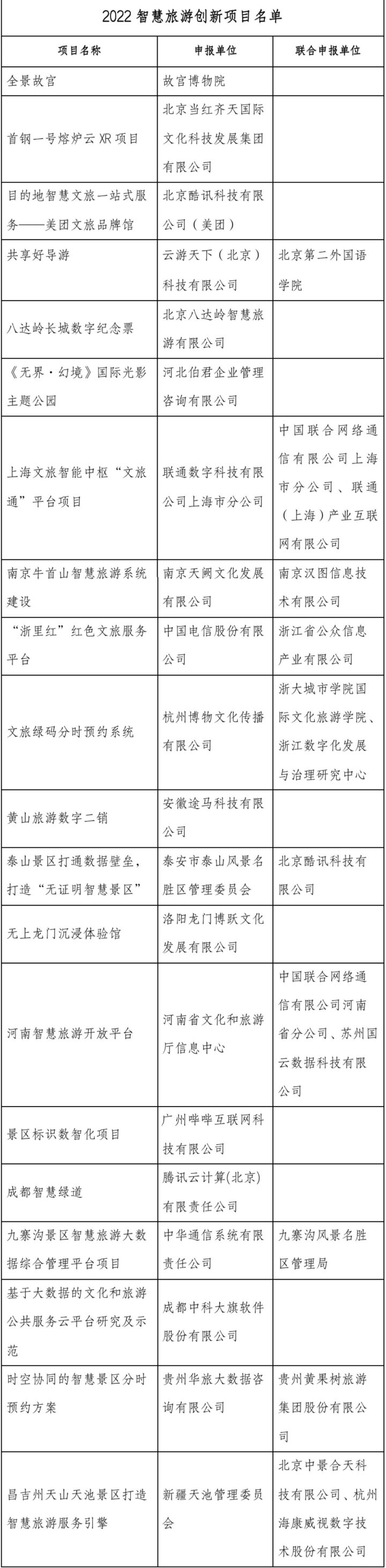 为深入贯彻落实《“十四五”旅游业发展规划》关于“培育一批智慧旅游创新企业和重点项目”的要求,由光明日报社、文化和旅游部资源开发司指导,光明网主办的“2022智慧旅游创新企业和项目推选与宣传活动”产生的“2022智慧旅游创新企业和项目”名单于11月9日正式揭晓。北京市慕田峪长城旅游服务有限公司、浙江力石科技股份有限公司等10家企业入选“2022智慧旅游创新企业”,首钢一号熔炉云XR项目、景区标识数智化项目等20个项目入选“2022智慧旅游创新项目”。