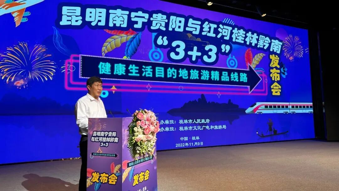 为进一步加大昆明、南宁、贵阳、红河、桂林、黔南六地文化旅游方面的合作,打造区域文旅融合品牌、推动全域旅游合作共赢。11月9日,昆明南宁贵阳红河桂林黔南“3+3”健康生活目的地精品旅游线路发布会在桂林市召开。
