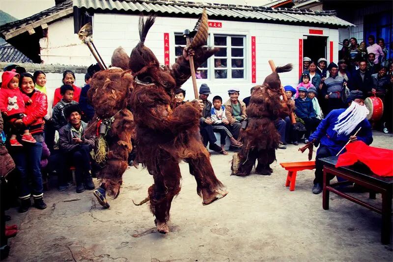 云龙县宝丰乡,伴随着过去盐井的开发,这里曾是马帮运盐的交通要道,路过马帮常在此下榻,故得名“客店”。流传千年的云龙山地白族打歌“力格高”,在这片热土经久不衰,宝丰乡也成为了云龙“力格高”的主要发源地和流传地。“力格高”也是当地文化活动中的一种重要形式,每当遇见重大民俗节庆,或是村寨中有人家举办婚丧嫁娶、起房竖柱等活动时,各地亲朋来到主人家中庆贺、帮忙。夜幕降临,大家在院子里点燃篝火,以火堆为圆心围成一圈,在鼓点声和踏地的节奏声中欢快舞蹈。“力格高”舞蹈套路繁多,民间相传有三十六套动作之多。每一套动作都来源于山地白族先民生活劳作的场景,或是模仿动物姿态。