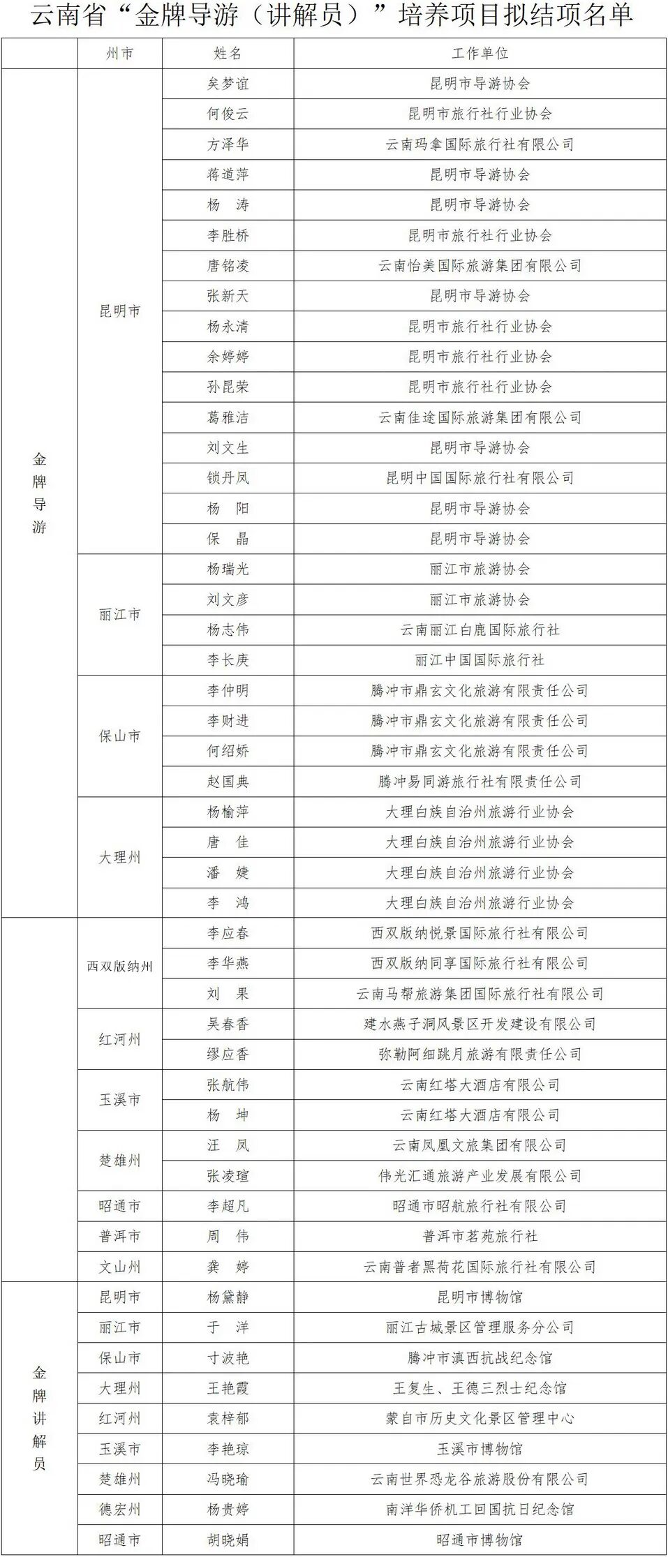 按照省文化和旅游厅办公室《关于开展第一批云南省“金牌导游(讲解员)”培养工作的通知》(云文旅办发〔2022〕32号)及工作计划,现将拟结项人员名单予以公示。