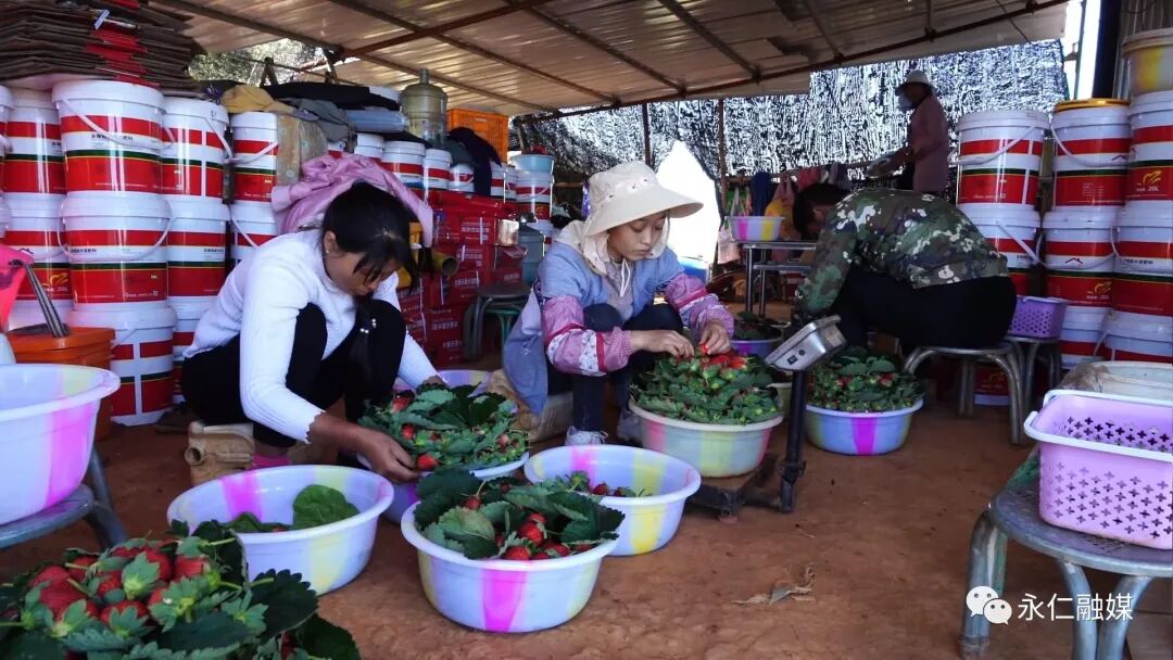 永仁宏鑫草莓专业合作社社员 高文兵说:“我们这里就是在分装草莓,装好看点老板拉去更好卖,价格更好点。”
