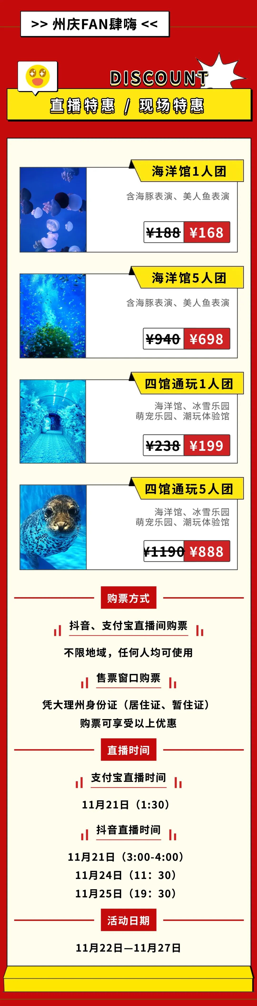 活动票价:成人原票价166元,州庆活动价40元;5人团购票原票价830元,州庆团购价188元;10人团购票原票价1660元,州庆团购价368元。