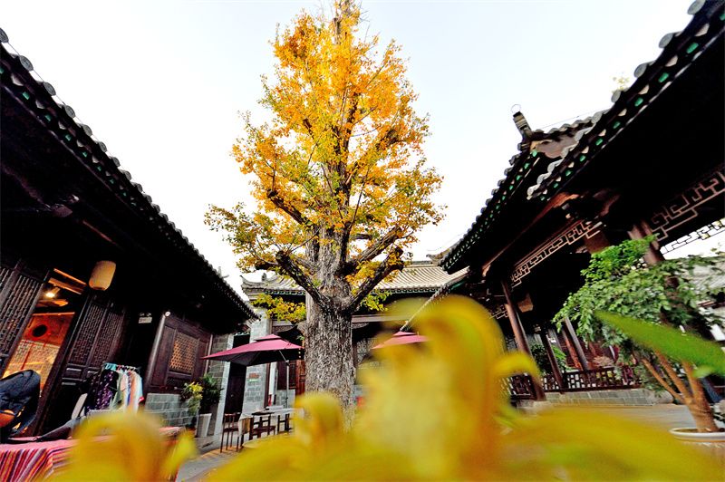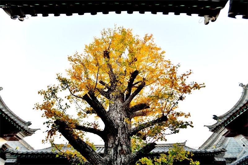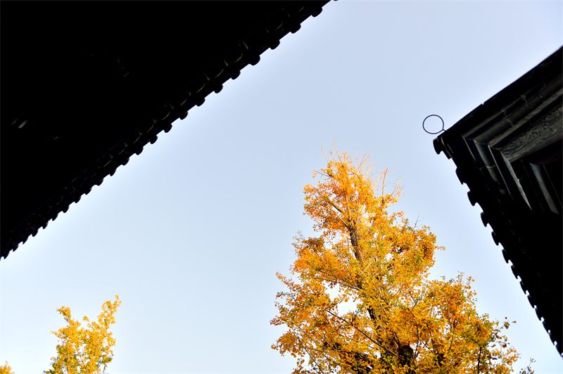 金黄的银杏树与古建筑交织