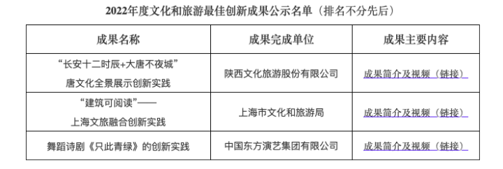 11月23日,文化和旅游部公示2022年度文化和旅游最佳创新成果。陕西文化旅游股份有限公司完成的“长安十二时辰+大唐不夜城”唐文化全景展示创新实践、上海市文化和旅游局完成的“建筑可阅读”——上海文旅融合创新实践、中国东方演艺集团有限公司完成的舞蹈诗剧《只此青绿》的创新实践3项成果拟入选2022年度文化和旅游最佳创新成果。公示期为7个自然日。