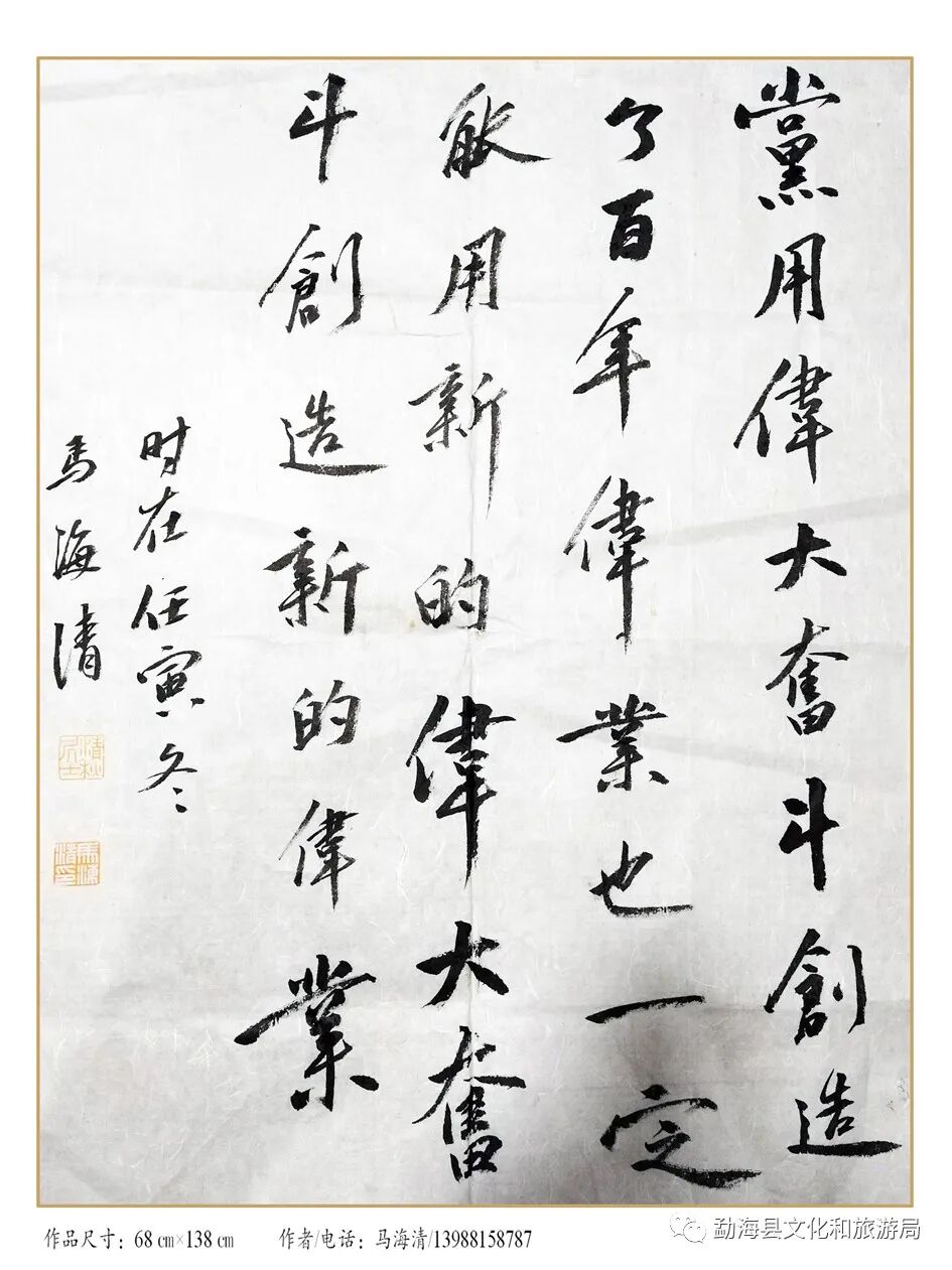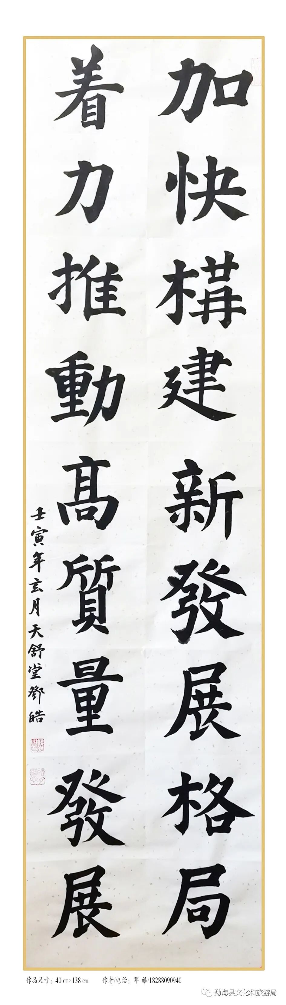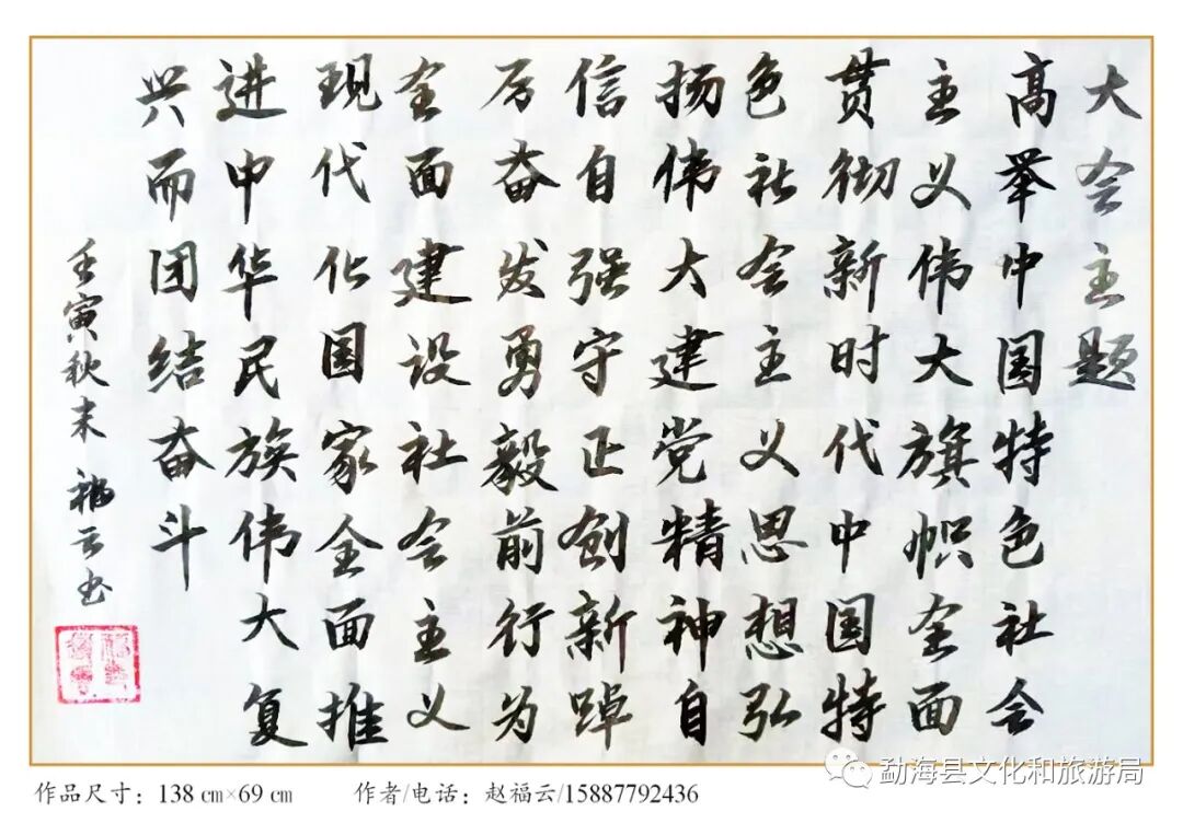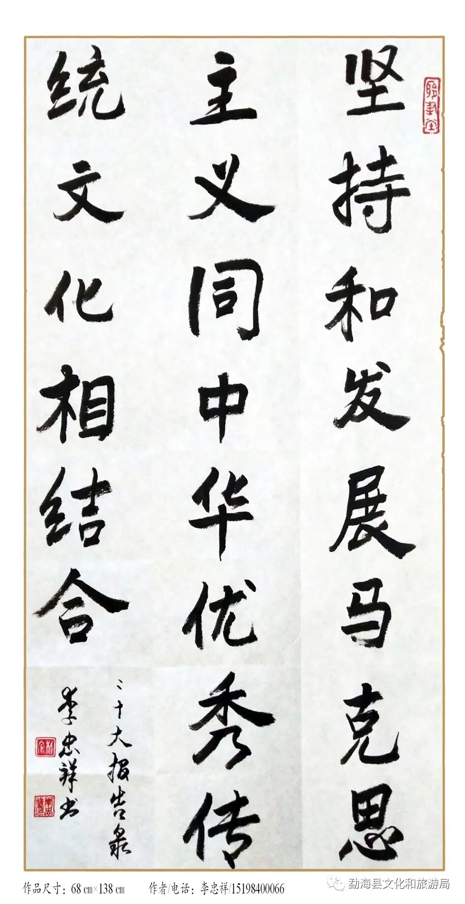 由勐海县文化和旅游局主办、勐海县文学艺术界联合会承办的“礼赞新时代·奋进新征程”书法作品网络展已于11月30日正式上线,将通过“云南公共文化云”“西双版纳掌上文旅”“春韵勐海”“勐海县文化和旅游局”“艺韵茶乡”等网络媒体相继进行线上展览。